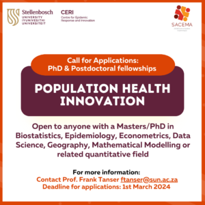 Fellows will be appointed at the Centre for Epidemic Response and Innovation (CERI) in the School for Data Science and Computational Thinking at Stellenbosch University in South Africa. Fellows will be awarded a well-paid tax-free fellowship for up to 3 years. The positions are based at superb facilities in Tygerberg and Stellenbosch. Whilst it is expected that fellows will be based on campus, opportunity exist to spend time at CERI’s field sites and/or with international collaborators for collaborative visits.
