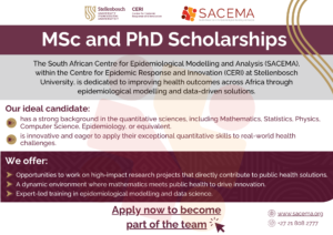 SACEMA invites applications for MSc and PhD positions in infectious disease epidemiological modelling. We seek individuals with a strong background in quantitative sciences, including Mathematics, Statistics, Physics, Computer Science, Epidemiology, etc., to join our innovative research projects.