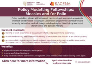 SACEMA invites Africans passionate about public health to apply for the 2025 Policy Modelling Fellowship cohort. We seek individuals with experience in a quantitative field that have established working relationships with Ministry of Health decision makers in their country, as well as access to measles or polio vaccine and incidence data.