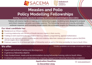 SACEMA invites Africans passionate about public health to apply for the 2026 Policy Modelling Fellowship cohort. We seek individuals with experience in a quantitative field that have established working relationships with Ministry of Health decision makers in their country, as well as access to measles or polio vaccine and incidence data.